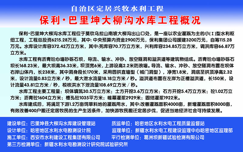 大柳溝水庫位于新疆維吾爾自治區(qū)巴里坤縣莫?dú)J烏拉山南坡,距哈密市154km。地理位置東經(jīng)93°35.5'-38',北緯43°35'-37'。水庫距巴里坤縣54.0km,有鄉(xiāng)村公路相通,交通比較便利。工程屬攔河式水庫。承擔(dān)下游灌溉、人畜用水的任務(wù),同時兼防洪功能,水庫控制灌溉面積1.2萬畝。水庫總庫容372.42萬m3,最大壩高36.33m,壩頂長168.23m。樞紐工程由攔河壩,導(dǎo)流放水洞,溢洪道等建筑物組成。工程規(guī)模屬小(1)型。