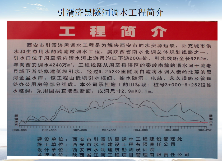 該工程屬陜西省南水北調(diào)總體規(guī)劃線路之一,引水口位于周至境內(nèi)湑水河上游吊溝口下游200m處,引水線路全長(zhǎng)6252m,年向西安調(diào)水4248萬m3。由低壩引水樞紐、輸水隧洞、電站、永久道路及管理處辦公用房等部分組成。